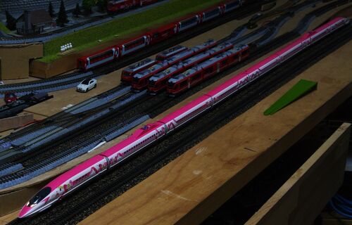 今日は、走行させます。 でも、我が家のレイアウトは、レーティッシュ鉄道を想定したものなので、 よく見える路線はR150なので新幹線は走れません。 しかし、わき役としてスイス国鉄の複線路線があります。 でも、ほとんどトンネルです。 ともかく、走らせま…